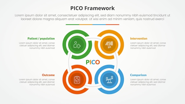 PICO framework infographic koncept til slidepræsentation med stor blomster center cirkel venn kombination med 4 punktliste med flad stil