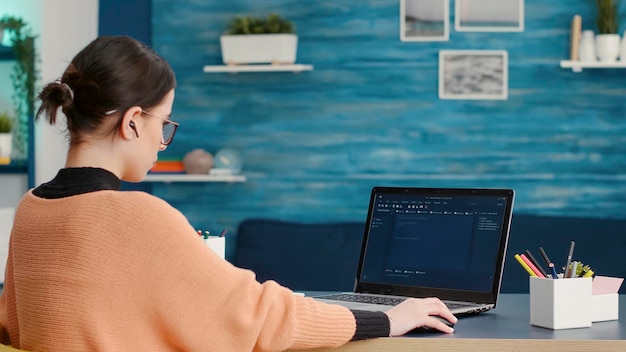Kvindelig koder, der programmerer analyserapport på teknisk interface og bruger hackingsoftware til at oprette binær kodeinformation og data. Programmør, der bruger virtuelt system og netværk på bærbar computer.